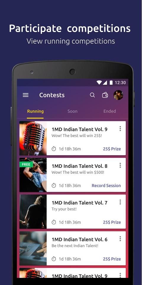 At this music app you will not just win money prizes like 2500 INR, but also could win studio record, recording contract and even chat with one of our talent hunters that is searching for the next singer.