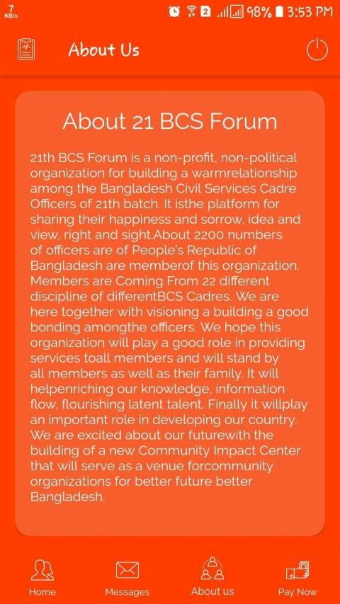 21 BCS(Admin) Forum Payment is a non-profit, non-political organization for building a warm relationship among the Bangladesh Civil Services Cadre Officers of 21st batch. It is the platform for sharing their happiness and sorrow, idea and view, right and sight.About 2200 numbers of officers are of People’s Republic of Bangladesh are member of this organization. Members are Coming From 22 different discipline of different BCS Cadres. We are here together with visioning a building a good bonding among the officers. We hope this organization will play a good role in providing services total members and will stand by all members as well as their family. It will help enriching our knowledge, information flow, flourishing latent talent. Finally it will play an important role in developing our country. We are excited about our future with the building of a new Community Impact Center that will serve as a venue for community organizations for better future better Bangladesh.