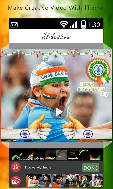 संगीत एप्लिकेशन के साथ गणतंत्र दिवस वीडियो निर्माता आप सेकंड में अपने मोबाइल से छवि स्लाइड शो बनाने के लिए, स्लाइड समय, फ्रेम और फिल्टर प्रभाव के साथ मदद करता है। सुंदर संगीत स्लाइड शो बनाने और जीवन में सबसे अच्छा अवसरों के लिए दोस्तों और परिवार के साथ साझा करें।