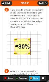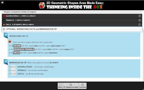 The purpose of this app is to show a student how to quickly determine or estimate the area of several regular 2D geometric shapes easily and efficiently by placing them "INSIDE A BOX" (square or rectangle) and using simple techniques.