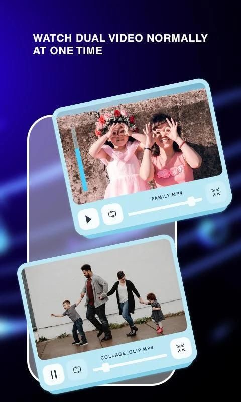 This app Dual Video Music Player allows you to watch multiple video simultaneously in a single screen. Also play multiple audio in multiple music player. Control their volume separately to hear & balance the audio sound of multiple audio & videos.
