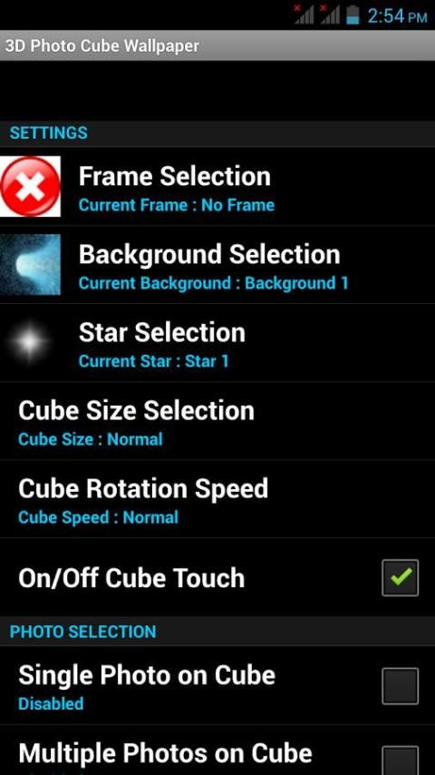 This Free App is specially created with HD quality 3D Photo Cube Frames Insert your favorite Pics in awesome 3D Photo Cube frames. Decorate your mobile with beautiful 3D Photo Cube with your own photos as mobile backgrounds. This free wallpaper has amazing features like: * Choose your favorite Frame From Frame selection * Select background from various HD background images * Select your favorite star selection * Choose the size of the cube * Choose the Rotation Speed of the cube * On/off Touching the cube * Choose Photo Selection like Single photo/ Multiple photo On cube * Take a new photo from camera or choose photo from your mobile gallery