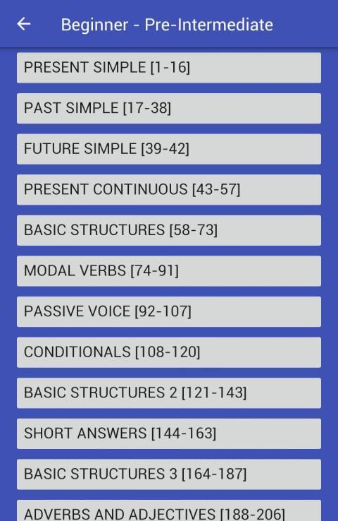 You will not see only tests. You will also see explanations for each test. It will help you to understand your weak points and improve your knowledge greatly. It's for all levels - Beginner, Elementary, Pre-Intermediate, Intermediate, Upper-Intermediate, Advanced. You will learn English grammar step by step (from simple topics to more difficult ones).