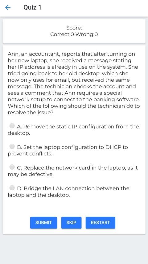 A + Study Prep Plus CompTIA द्वारा संबद्ध या समर्थित नहीं है। CompTIA A + अध्ययन तैयारी प्लस सामग्री के बारे में कोई प्रतिनिधित्व नहीं करता है। उपयोग किए गए सभी प्रश्नोत्तरी प्रश्न संबंधित स्वामियों के हैं।