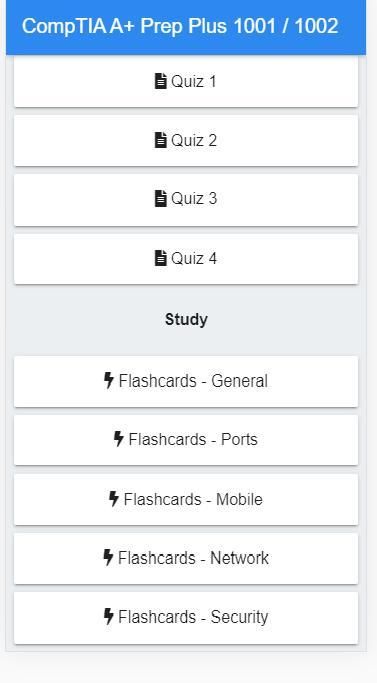 A+ Study Prep Plus - CompTIA A+ 1001 - 1002 is a wonderful tool to use for practice tests and flashcards for on the go study! Our questions come from past students who have taken and passed the exam. We keep our quizzes at 25 questions so you always have the opportunity to squeeze in a study session.