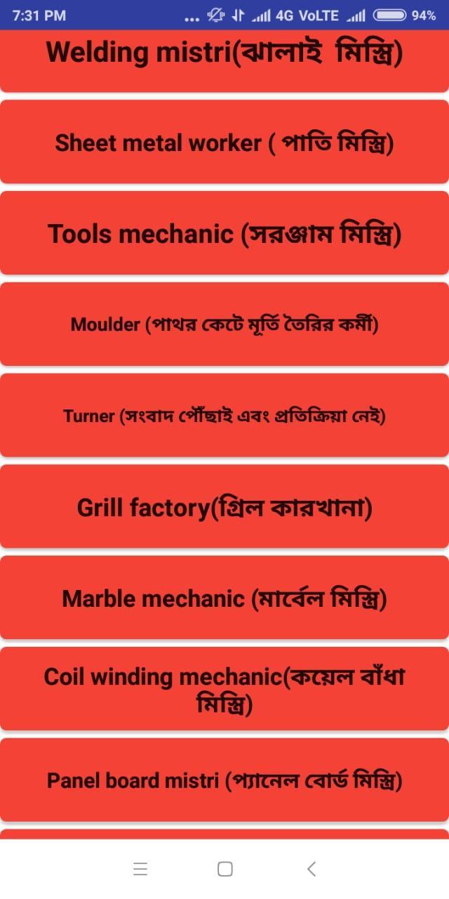 যে কোন প্রয়োজনে এই আপ থেকে দৈনন্দিন জীবনের জাবতিয় সমসার সমাধান করতে পরবেন তাদের কন্টাক্ট নম্বর দিয়ে। যেমন ইলেকট্রিক্যাল মিস্ত্রি থেকে সুরু করে ইঞ্জিন মিস্ত্রি ।ওয়েল্ডিং থেকে সুরু করে পাতি মিস্ত্রি। মইরা