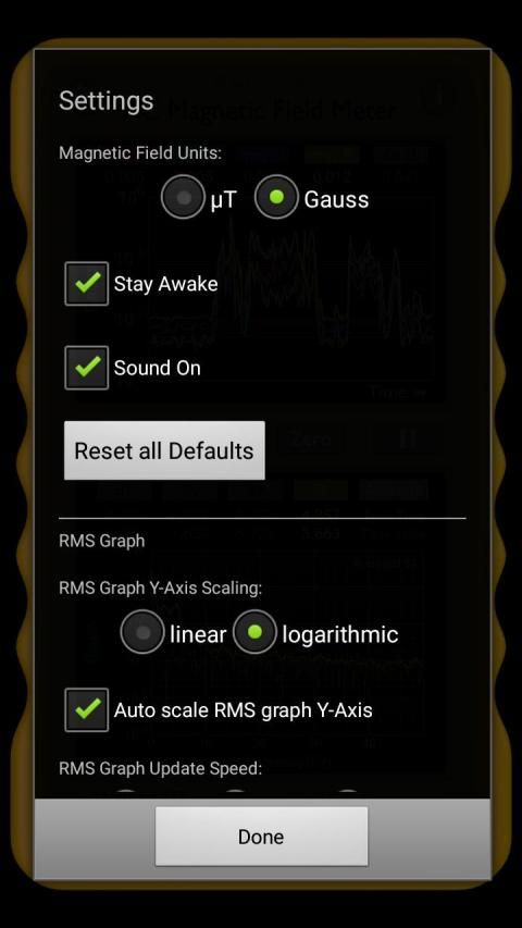 • गेज X, Y में आरएमएस बी क्षेत्र या Z दिशा-निर्देश या परिमाण से दिखाने के लिए। या वैकल्पिक रूप से डीसी चुंबकीय क्षेत्र को दिखाते हैं।
