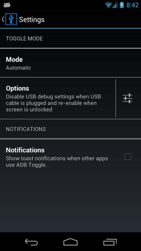ADB Toggle is a security tool that allows you to toggle the USB debug settings. You can toggle with the homescreen widget or use the automatic mode. In the automatic mode the USB debug settings will be disabled when you unplug your phone (or turn off your screen), and is only enabled again after you have unlocked your screen.