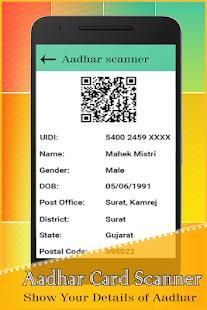 आधार कार्ड स्कैनर: लिखने के लिए या अपनी जानकारी जोड़ने के लिए, बस अपने आधार कार्ड QR कोड को स्कैन और अपने सभी जानकारी प्राप्त की कोई ज़रूरत नहीं। अब मान्य और सत्यापित करें किसी भी आधार कार्ड, अगर यह एक वैध आधार कार्ड आप हमारी क्षुधा का उपयोग करें और कार्ड स्कैन और सभी जानकारी प्राप्त कर सकते है।