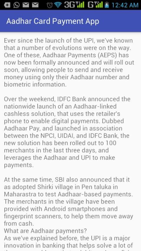 आधार वेतन एप्लिकेशन जानकारी आप आधार का उपयोग एप्लिकेशन की जानकारी देना है और स्वच्छ और कैशलेस भारत का एक हिस्सा होने के लिए प्रोत्साहित करने में मदद करता