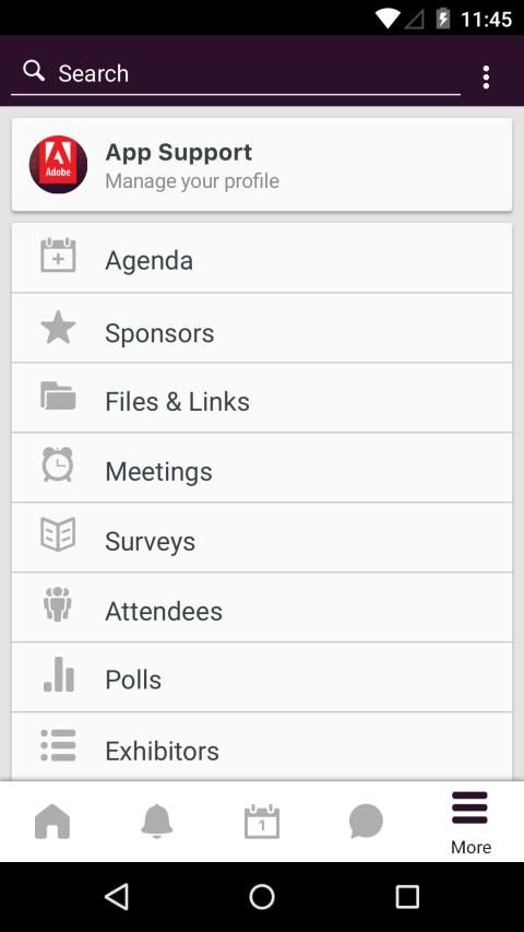 • Agenda—view the full schedule and related information (session time, room number, speaker info, etc)
