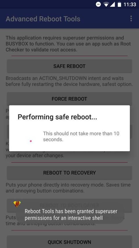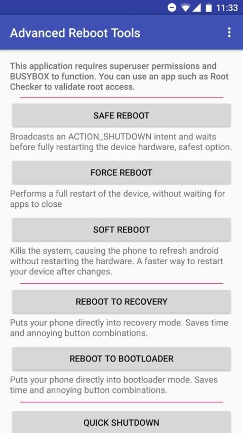 उन्नत रिबूट उपकरण, अपने फोन को पुन: प्रारंभ समय और fiddly बटन संयोजनों को बचाने के लिए विभिन्न विकल्पों में से एक पैकेज है। अनुप्रयोग में के लिए विकल्प हैं: