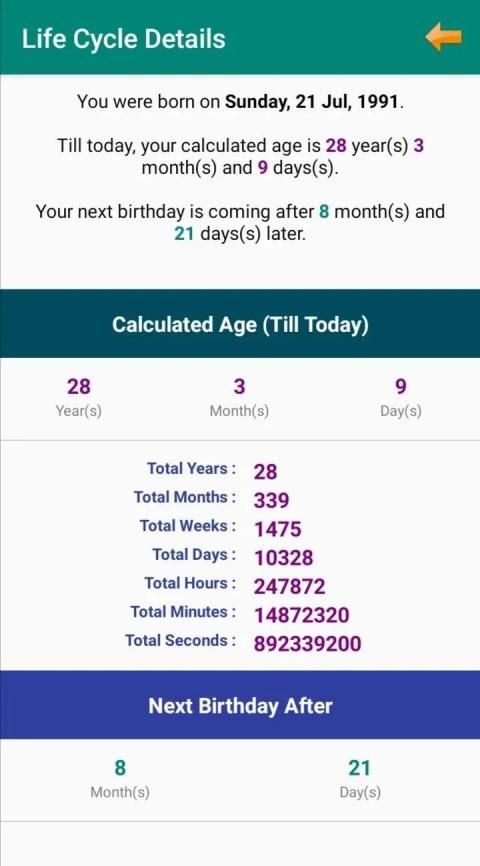 Year वर्ष, महीने, दिन, घंटे, मिनट और सेकंड में अपने कुल जीवन चक्र का पता लगाएं।