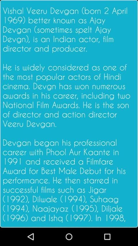 In this Ajay Devgan App, you can read Biography, Filmography, Feed and watch videos as Movies, Songs, Trailer, Interview, Awards.