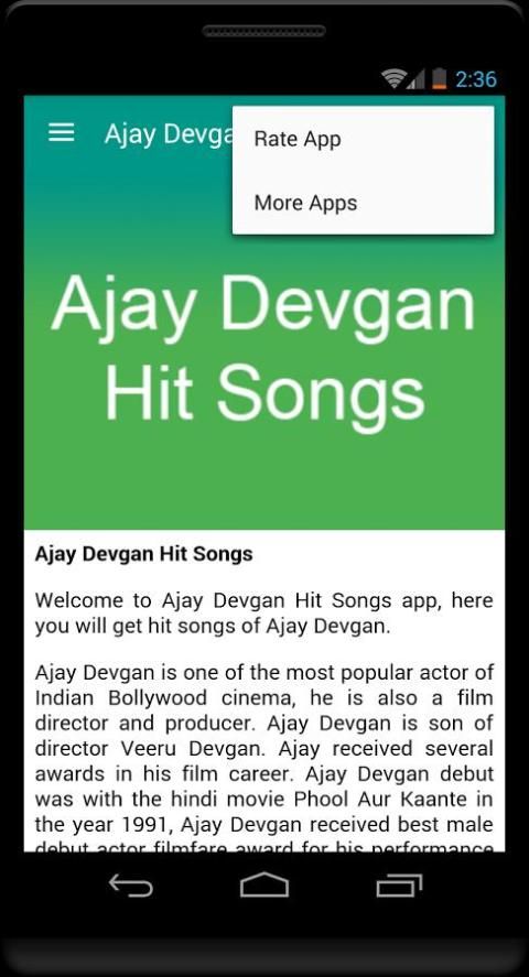 Ajay Devgan is one of the most popular actor of Indian Bollywood cinema, he is also a film director and producer. Ajay Devgan is son of director Veeru Devgan. Ajay received several awards in his film career. Ajay Devgan debut was with the hindi movie Phool Aur Kaante in the year 1991, Ajay Devgan received best male debut actor filmfare award for his performance in this movie. Some of Ajay Devgan hit hindi movies are Jigar, Dilwale, Suhaag, Naajayaz, Diljale, Ishq, Zakhm, Hum Dil De Chuke Sanam, Deewangee, The Legend of Bhagat Singh, Raincoat, Yuva, Apaharan, Golmaal, Halla Bol, Golmaal Returns, Golmaal 3, Raajneeti, Singham, Bol Bachchan, Son of Sardar, Singham Returns, Drishyam. Ajay Devgan is one of the actor who acted in more than 80 hindi movies. Ajay Devgan married most famous Indian film actress Kajol in the year 1999. Ajay Devgan recent movie was Drishyam and was super hit. Ajay Devgan upcoming hindi movies are Baadshaho opposite Shruti Haasan and Shivaay. In this app you will get hindi songs of Ajay Devgan.