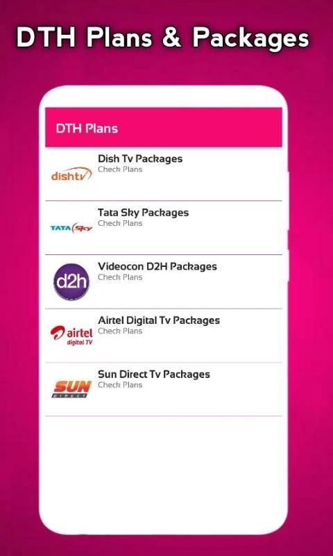 This app also provide to check dth plans and packages. It include tata sky packages, sundirect packages and all.