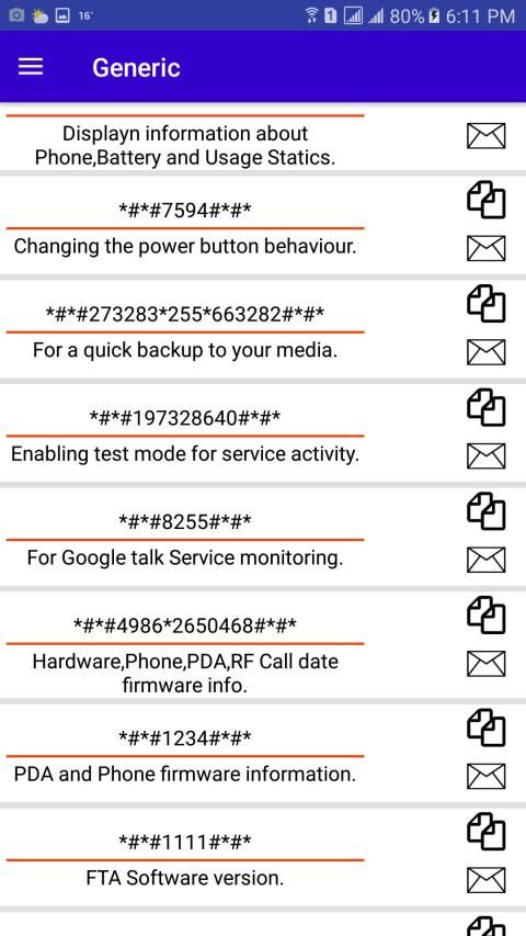 सभी मोबाइल गुप्त कोड शामिल कर IMEI नंबर, सुपर मोड, सेवा मेनू, नेटवर्क, जीपीएस, ब्लूटूथ, WLAN परीक्षण, फर्मवेयर संस्करण जानकारी, कारखाने परीक्षण, PDACheck अद्यतन, डिवाइस रीसेट, deviceSoftware सूचना, हार्डवेयर सूचना, टेस्ट फोटोग्राफ आरजीबी अनलॉक प्रदर्शित और भी बहुत कुछ।