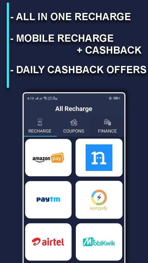 सभी रिचार्ज ऐप के साथ ऑनलाइन मोबाइल रिचार्ज करें। सभी प्रीपेड और पोस्टपेड मोबाइल रिचार्ज, डीटीएच बिल भुगतान और धन हस्तांतरण, मोबाइल ऑनलाइन रिचार्ज, मोबाइल रिचार्ज ऐप।