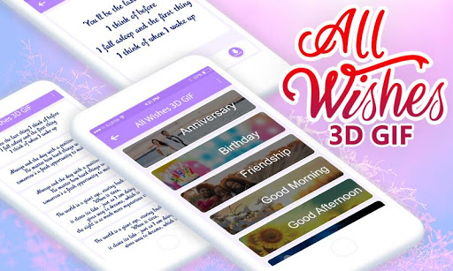 सभी इच्छाएं 3 डी गिफ की इतनी अलग श्रेणियां हैं जैसे: सुप्रभात, शुभ दोपहर, शुभ रात्रि, प्यार, जन्मदिन, सालगिरह, दोस्ती, आपको याद आती है और बहुत अधिक संग्रह