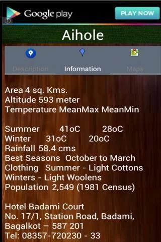 इस आवेदन के पर्यटकों को उनके बजट सीमा से सबसे अच्छा होटल का चयन करने के लिए मदद करता है. यह सभी पर्यटन स्थलों के होटल और ट्रैवल एजेंटों के फोन नंबरों की सूची. आवेदन उपग्रह दृश्य के साथ क्षेत्र के नक्शे लोड करता है. आवेदन के उपयोगकर्ता एक जिले का चयन करें या "करतें" सूची से एक जगह का चयन करने के लिए कर्नाटक राज्य में पर्यटकों के आकर्षण का पूरा विवरण प्राप्त कर सकते हैं.