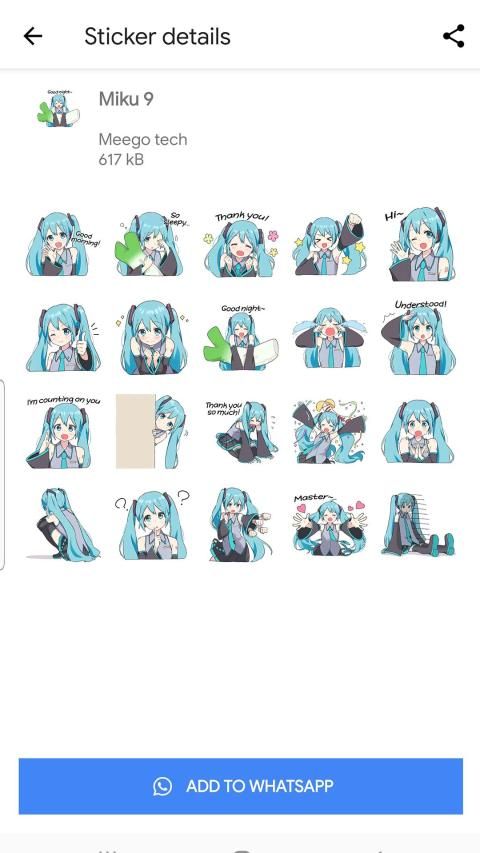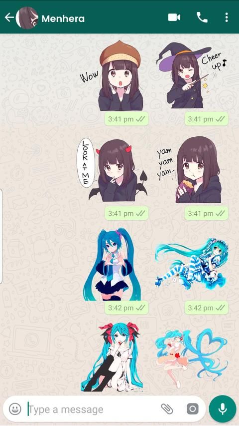 Sticker character whatsapp Menhera-chan, Miku, Eirs and Taiga-Aisaka with English translate text, 45 sticker packs, 1000+ sticker added with different themes: Good morning theme, Good night theme, Spring theme, Summer theme, Winter theme, New Year theme, Halloween theme sticker and much more.
