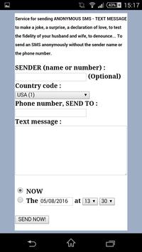 Send Anonymous spoof SMS without registration. Use this service for sending ANONYMOUS SMS to make a joke, a surprise, a declaration of love, to test the fedelity of your spouse, to denounce... To send an SMS anonymously without the sender name or the phone number.