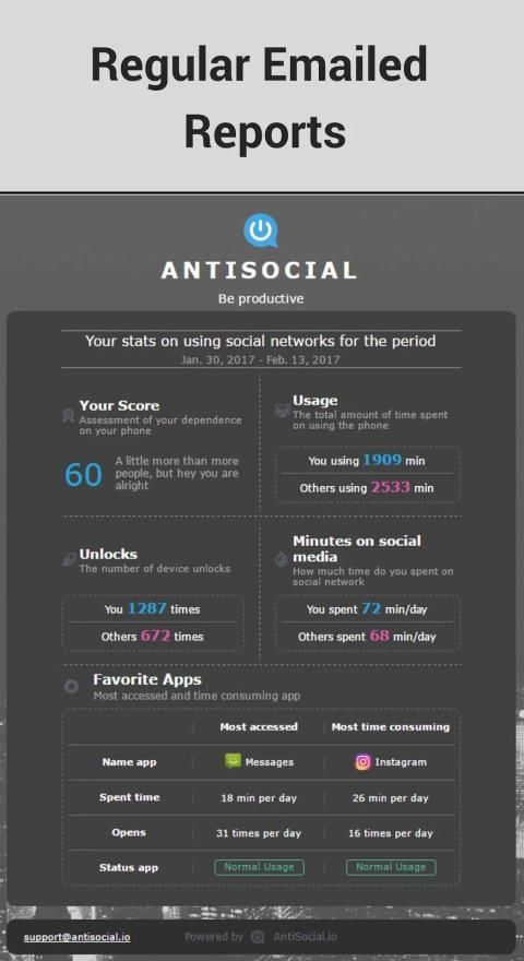While there are other apps available that are designed to restrict phone usage, AntiSocial feels strongly about empowering the user by giving them the information they need to take necessary action. This is done through the clearest and most simple interface available and is the only app to deliver detailed reports full of all the information you need to make an informed decision.