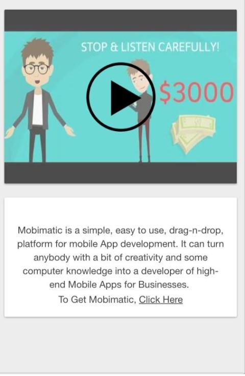 अनुप्रयोग निर्माता एक साधारण व्यापार अनुप्रयोग Mobimatic प्लेटफार्म के साथ बनाई गई है। इसका मुख्य सामग्री को कैसे Mobimatic मंच के साथ ही कैसे विभिन्न मोबाइल सॉफ्टवेयर है कि Mobimatic प्लेटफार्म के साथ बनाया जा सकता है बेचने के लिए पर कुछ विचार का उपयोग करने पर वीडियो प्रशिक्षण दिया जाता है।