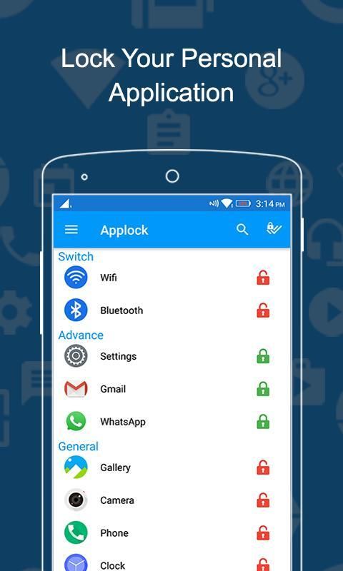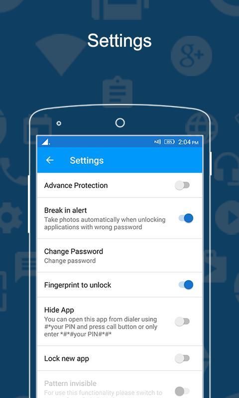 आपका संदेश, ईमेल, एल्बम, संपर्क, ब्राउज़र, गैलरी, एसएमएस लॉक आदि पिनकोड ताला, पैटर्न ताला और फिंगरप्रिंट लॉक के साथ गोपनीयता की रक्षा। एंड्रॉयड 6.0+ में फिंगरप्रिंट समर्थन करते हैं। और अधिक आसानी से और जल्दी से अनलॉक। सुरक्षा सुनिश्चित करें।