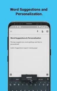 Arabic Keyboard uses the previously typed words in a sentence to predict a list of potential words that may follow it. Feature improves with usage and adds customizability.