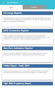 डैशबोर्ड और रिपोर्ट: सिस्टम उत्पन्न डैशबोर्ड और प्रबंधकों के लिए संबंधित स्वास्थ्य सुविधा और जिले में एकत्रित और राज्य के लिए रिपोर्ट।