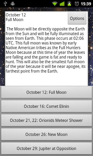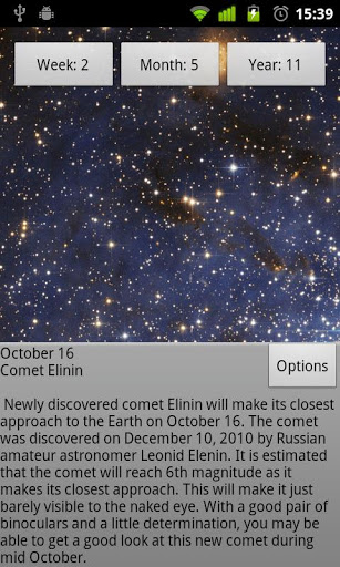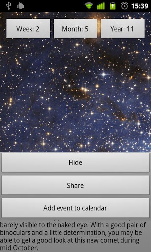 If your are interested in whats going on in the universe, this is the perfect App for you. See events out the year Add event to your standard calendar share events via email sms, ,,,