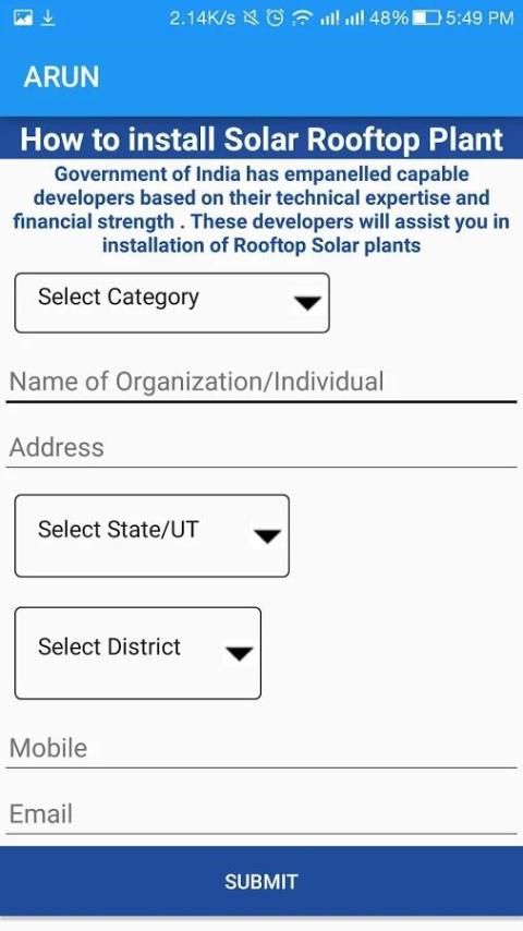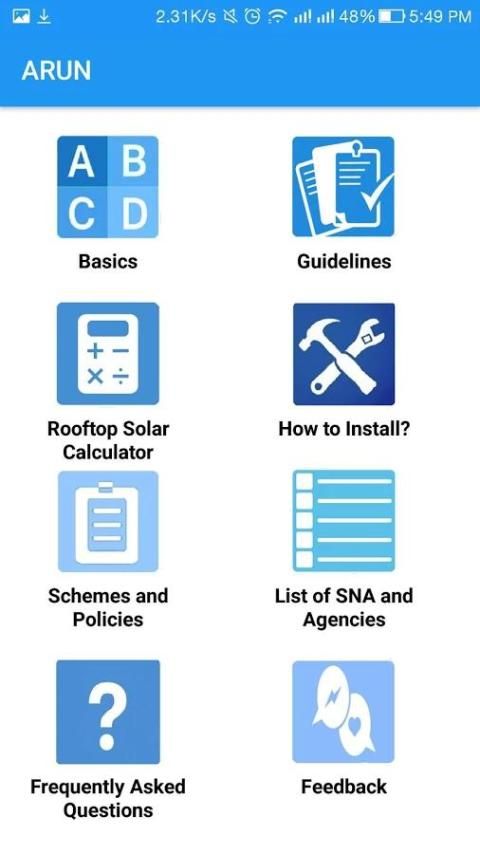 मोबाइल ऐप अरुण (अटल छत सौर उपयोगकर्ता नेविगेटर) सौर छत प्रणालियों और सौर छत प्रणालियों के प्रतिष्ठानों की सहायता के प्रमोशन के लिए नवीन और नवीकरणीय ऊर्जा मंत्रालय के लिए विकसित की है। अनुप्रयोग के मुख्य कार्यक्षमताओं बुनियादी बातें सौर छत प्रणाली, के बारे में जाना जाने शामिल दिशानिर्देश सौर छत प्रणाली, प्रतिष्ठानों की लागत की गणना के लिए एक कैलकुलेटर, सौर छत प्रणाली, योजनाओं और नीतियों सौर छत से संबंधित की स्थापना की विधि की स्थापना के लिए अलग-अलग राज्यों की प्रणाली, राज्य नोडल एजेंसियों की सूची और अपने राज्य में निजी एजेंसियों को मंजूरी दे दी, बार-बार पूछे सौर छत और अनुप्रयोग के बारे में या यदि आप सौर छत से संबंधित कुछ पूछताछ करना चाहते प्रतिक्रिया के बारे में प्रश्न। इस एप्लिकेशन के एक सरल जो आम आदमी या उनके परिसर में सौर छत की स्थापना के लिए एक एजेंसी के लिए उपयोगी हो जाएगा। कैलकुलेटर सौर छत प्रणाली की स्थापना का अनुमान पाने के लिए इस्तेमाल किया जा सकता है। स्थापना विधि के माध्यम से एक सौर छत की स्थापना के लिए उनके हित अनुरोध प्रस्तुत कर सकते हैं और एक ही अपने राज्य की संबंधित एजेंसियों के लिए और आगे की मदद प्रतिष्ठानों के लिए इन एजेंसियों ग्राहक से संपर्क करेगा लिए जाना जाएगा। एप्लिकेशन को राष्ट्रीय सूचना विज्ञान केन्द्र, नई और नवीकरणीय ऊर्जा मंत्रालय द्वारा विकसित की है।