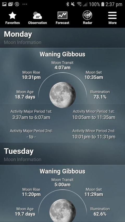 - Exclusive celestial information from sunrise, sunset, moonrise, moonset to major and minor periods information used by fishermen and hunters.