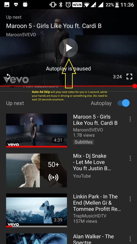 ऑटो स्किप विज्ञापन केवल एक सेकंड में अगला वीडियो चलाएगा, प्ले बटन पर क्लिक करने की कोई आवश्यकता नहीं है