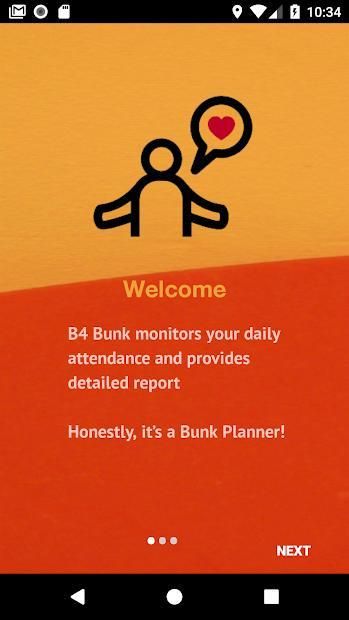 B4 bunk is Literally a bunk Manager! It calculates the total percentage and Notifies the user so that he/she can plan how much more days to Bunk!