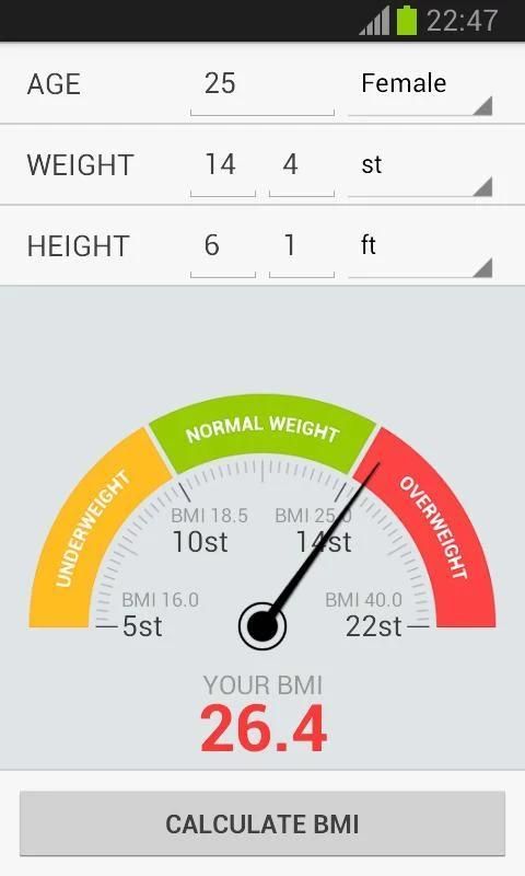The Body Mass Index is a way of seeing if your weight is appropriate for your height. Inaccuracies can occur if you're an athlete or very muscular as this can give you a higher BMI even if you have a healthy level of body fat. Also this app is not appropriate for women who are pregnant or breastfeeding, or people who are very frail.