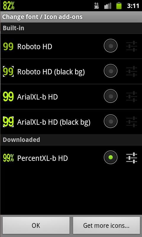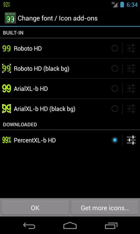 उनकी मंद स्थिति सलाखों पर संभव प्रतिभाशाली रंग है जो इच्छा एंड्रॉयड 3.x / 4.x उपयोगकर्ताओं के लिए, फ़ॉन्ट नाम के बाद "बी" के साथ हमारे HD Add-ons के लिए देखो। बैटरी सूचक प्रो बीटी के भीतर है HD ऐड-ऑन करें या Google Play पर अपने ब्राउज़र में "bnbt" के लिए खोज।