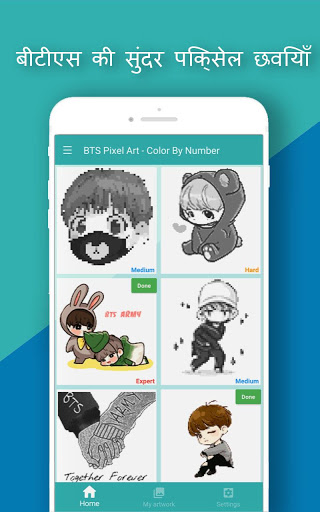 बीटीएस पिक्सेल आर्ट - कलर बाई नंबर, वयस्कों, बच्चों और बीटीएस प्रशंसकों के लिए विशेष रूप से एक पूरी तरह से नई रंग पुस्तक, आपको के-पीओपी स्टार के बारे में संख्याओं द्वारा सैकड़ों सुंदर, मजेदार और प्यारा पिक्सेल कला पेंट करने की अनुमति देता है। 200 सुंदर कलाकृतियाँ, 5 एचडी चुनौतीपूर्ण चित्र जो आपको नंबर से रंगने के लिए प्रदान किए गए हैं, सभी मुफ़्त!