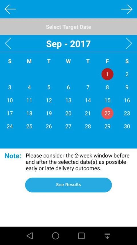 बेबी प्रसव के माता-पिता की उम्मीद की अनुमति देता है कि किसी विशेष तिथि है कि वे या तो पर जन्म देने या पर बच्चे को जन्म देने से बचना चाहते हैं करना चाहते हैं लक्षित करने के लिए एक गर्भाधान गर्भावस्था एप्लिकेशन है। उदाहरण के लिए, वे को पूरा या उस तारीख का चयन करके क्रिसमस पर प्रसव से बचने के लिए चुन सकते हैं। एप्लिकेशन जोड़े को सूचित जब वे गर्भ धारण करने का प्रयास करना चाहिए।
