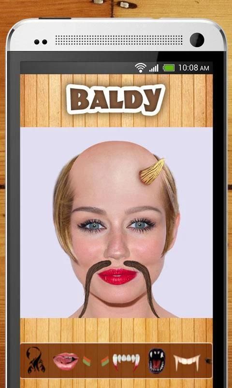 गंजा प्रभाव के साथ साथ आप अपने फोटो और अधिक मजेदार बनाने के लिए अजीब मूंछें, कान, नाक, होंठ, नेत्र, बाल और अन्य विकल्प के बहुत लागू कर सकते हैं।