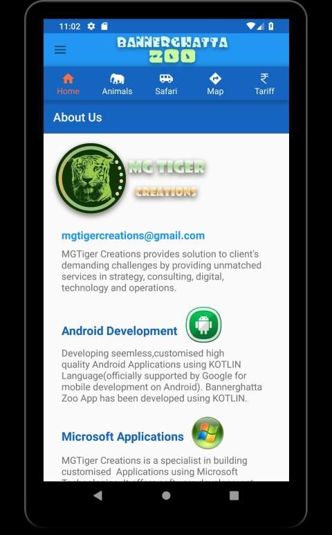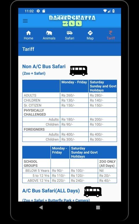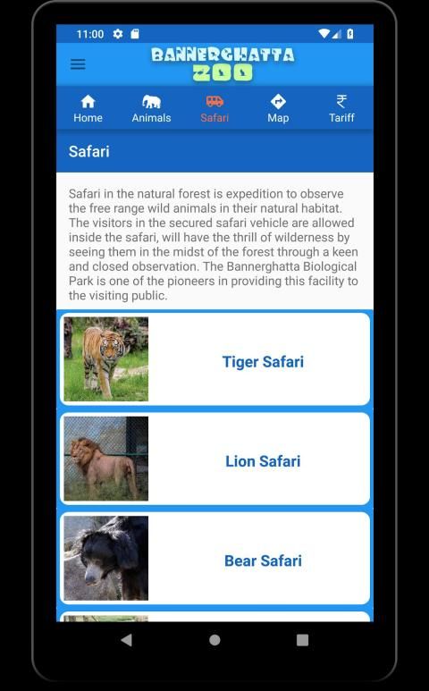 Bannerghatta Zoo or Bannerghatta Biological Park is located in Bangalore or Bengaluru. This zoo application offers information about the Animals, Birds and Reptiles with High quality Image and sound. It provides information on Safari Details at the Zoo and the Tariff of all the services provided by the Zoo.