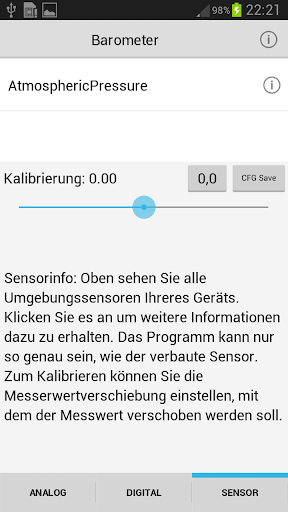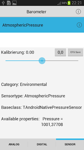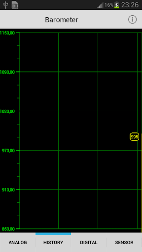 बैरोमीटर वर्तमान में हवा के दबाव से पता चलता है। इस उद्देश्य के लिए अपने फोन या गोली के हवा के दबाव सेंसर का इस्तेमाल किया जाता है।