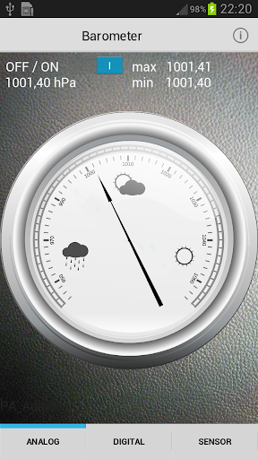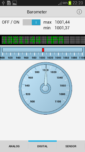 बैरोमीटर वर्तमान में हवा के दबाव, मापा अधिकतम और न्यूनतम प्रदान करता है। इसके अलावा, सेंसर की मापी मूल्य की सटीकता को बढ़ाने के लिए स्थानांतरित किया जा सकता है।