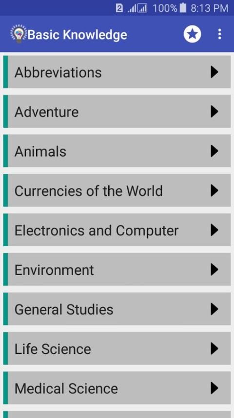 बुनियादी ज्ञान आवेदन ऐसी प्रौद्योगिकी, संकेताक्षर, साहसिक, इलेक्ट्रॉनिक्स और कंप्यूटर, जीवन विज्ञान, चिकित्सा विज्ञान, ब्रह्मांड, पर्यावरण और अधिक के रूप में विभिन्न विषयों पर विभिन्न प्रश्न होते हैं।
