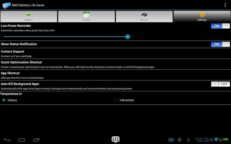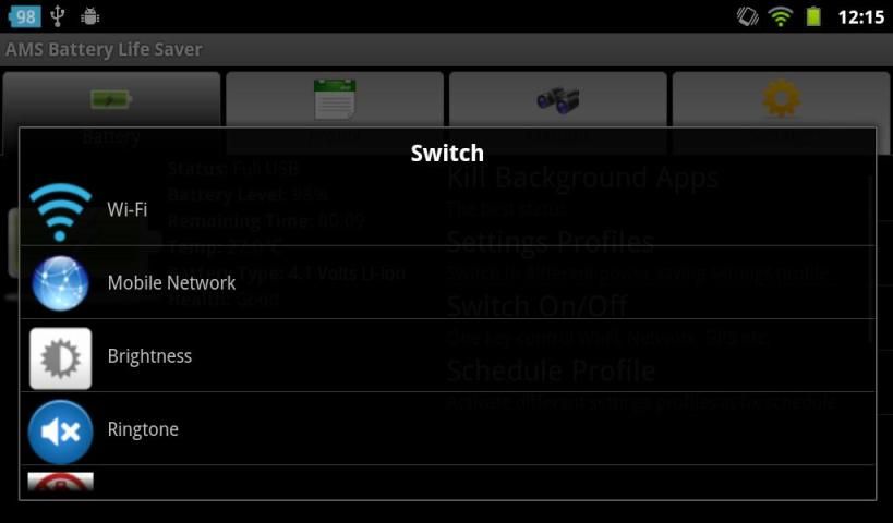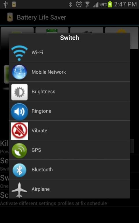 Battery Life Saver comes with built-in battery saving profiles. You can also create your own battery saving profiles. A battery saving profile is a group of settings to switch on/off certain features - all at once.