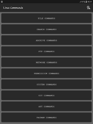 - File Commands, Search Commands, Archive Commands, FTP Commands, Network Commands, Permission Commands, System Commands, GIT Commands, APT Commands, pacman Commands