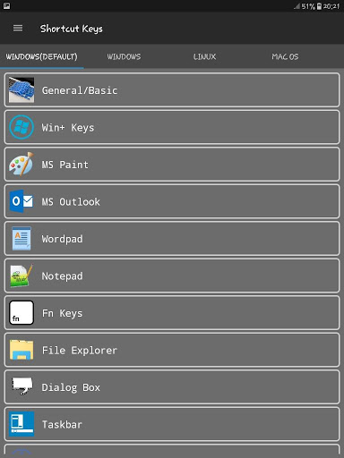 - General/Basic, Win Keys, MS Paint, MS Outlook, Wordpad, Notepad, Fn Keys, File Explorer, Dialog Box, Taskbar, Ease of Access, Magnifier, Narrator, Rearrange Apps, Media Player