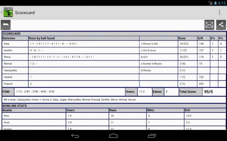 , गेंद सारांश तक गेंद मैच सारांश, मैच सांख्यिकी और पारी के आँकड़े उत्पन्न किया जा सकता है और यहां तक कि आप आदि ब्लूटूथ, जीमेल का उपयोग कर अपने दोस्तों को भेज सकते हैं