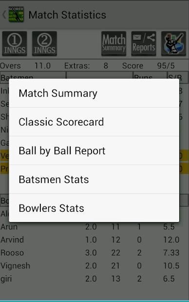 Ball by ball summary, Match summary, Match Statistics and Innings statistics can be generated and even you can send that to your friends using Bluetooth, GMail etc.,